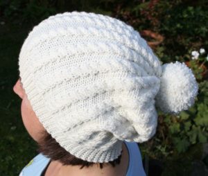 The twisted cable pattern on this hat is easy to work and extends right over the crown. This hat is knit on slightly oversized needles to give a looser fabric with a relaxed drape. Optional pompom!
